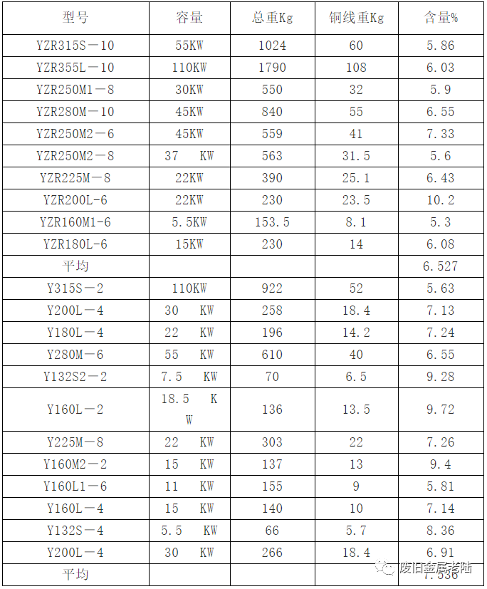 2.按电机千瓦判断:一千瓦按铜含量1公斤预估。这个方法偏差也比较大,不同型号的电机,每千瓦铜含量差距很大。Y系列起重机电机,按千瓦计算铜 含量,相对准确。Y系列和Y2系列则偏差太大。